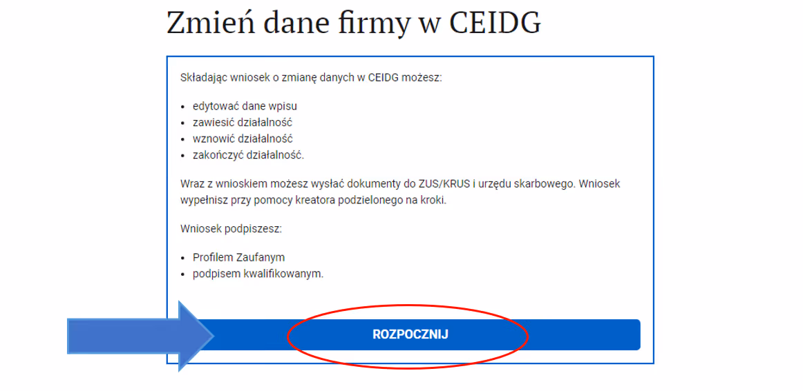 Krok 1: Wejdź na stronę biznes.gov.pl i wybierz "Zmień dane w CEIDG".