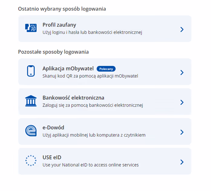 Krok 2: Wybierz opcję "Rozpocznij" i zaloguj się wybraną metodą (najczęściej Profil Zaufany).