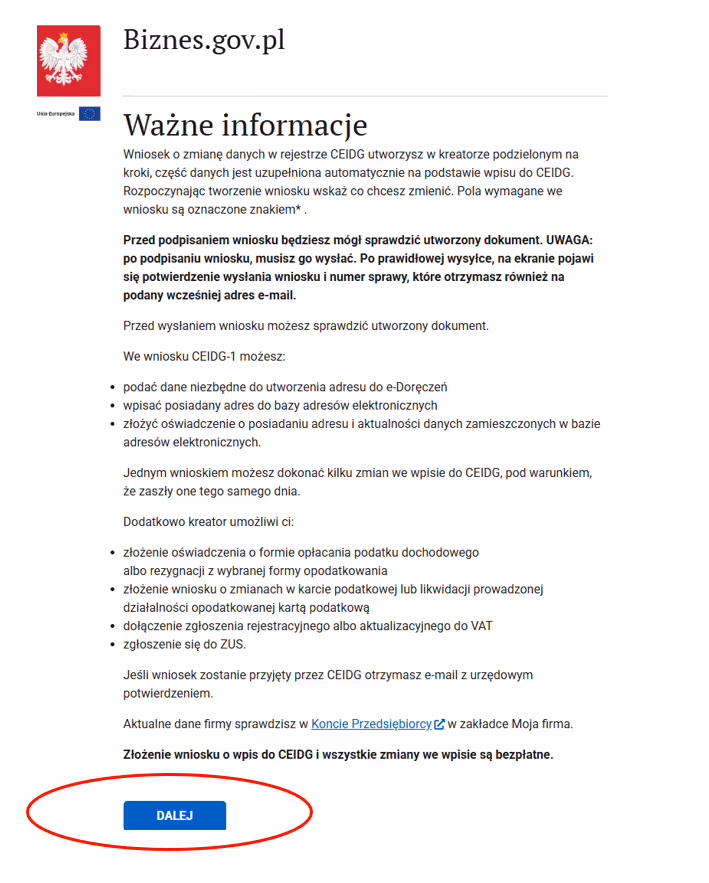 Krok 3: Pojawi się ważna informacja, z którą można się zapoznać. Ostatecznie wybierz "dalej” i przejdź do kolejnych kroków.