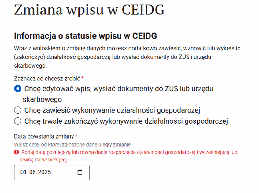 Krok 4: Wybierz opcję "Chcę edytować wpis, wysłać dokumenty do ZUS lub urzędu skarbowego”. Jako datę wybierz dzień zmiany adresu siedziby.