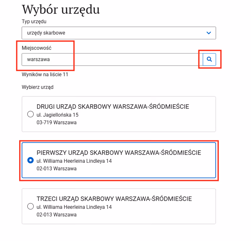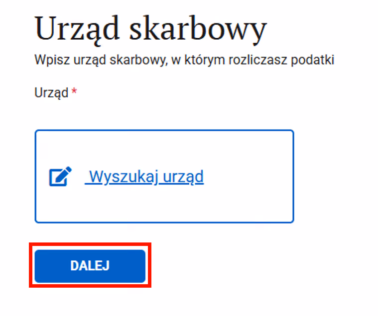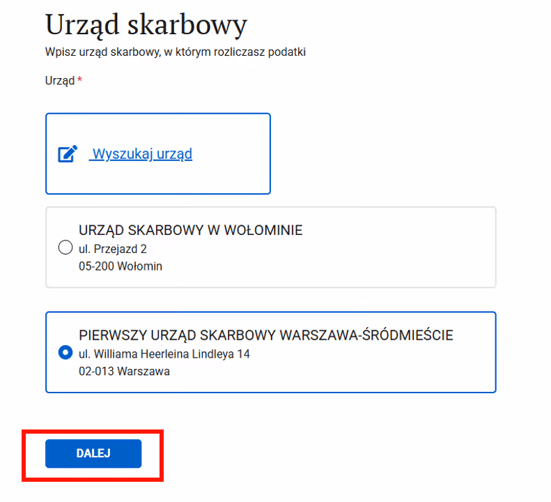 Krok 8: Wybierz urząd skarbowy, pod który podlega Twoja działalność.