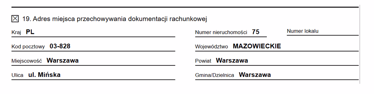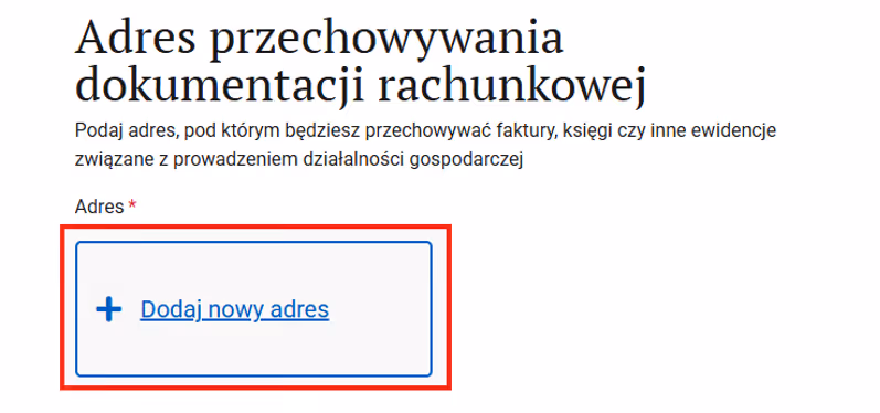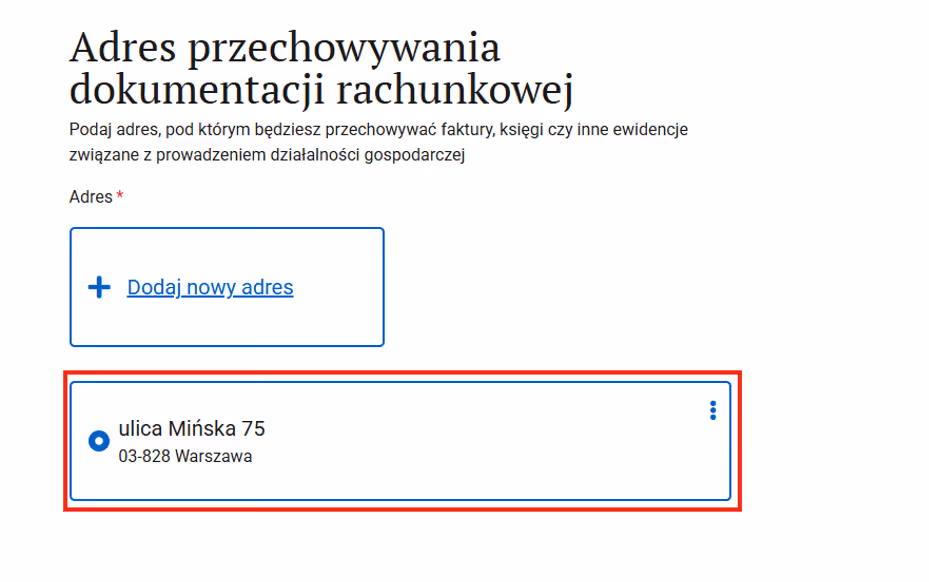 Krok 5: W sekcji „Podatki” wybierz "Adres przechowywania dokumentacji rachunkowej".