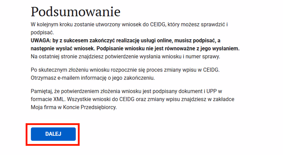 Krok 14: Wyświetli się komunikat podsumowujący cały proces. Kliknij "dalej”.