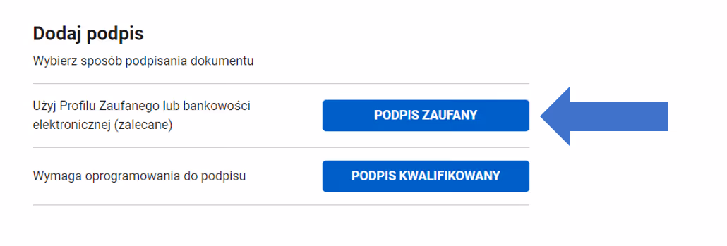 Krok 16: Podpisz dokument Profilem Zaufanym, Podpisem Kwalifikowanym lub przez bankowość elektroniczną.